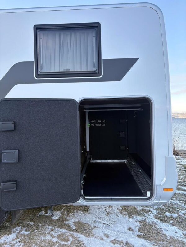 Grande soute garage traversante permettant de transporter vélos et équipements volumineux. Toiture équipée de panneaux solaires pour renforcer l’autonomie. Nombreux ouvrants et lanterneaux assurant luminosité et ventilation.