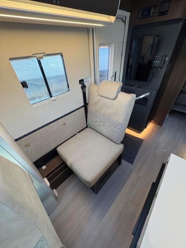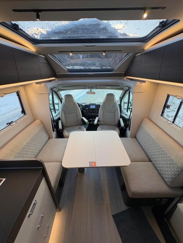 L’Adria Coral Supreme propose un intérieur moderne et raffiné avec une ambiance haut de gamme. Le salon face-face offre un espace de vie exceptionnel, lumineux et convivial, avec sièges cabine pivotants et grande table centrale.