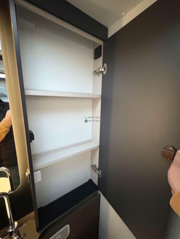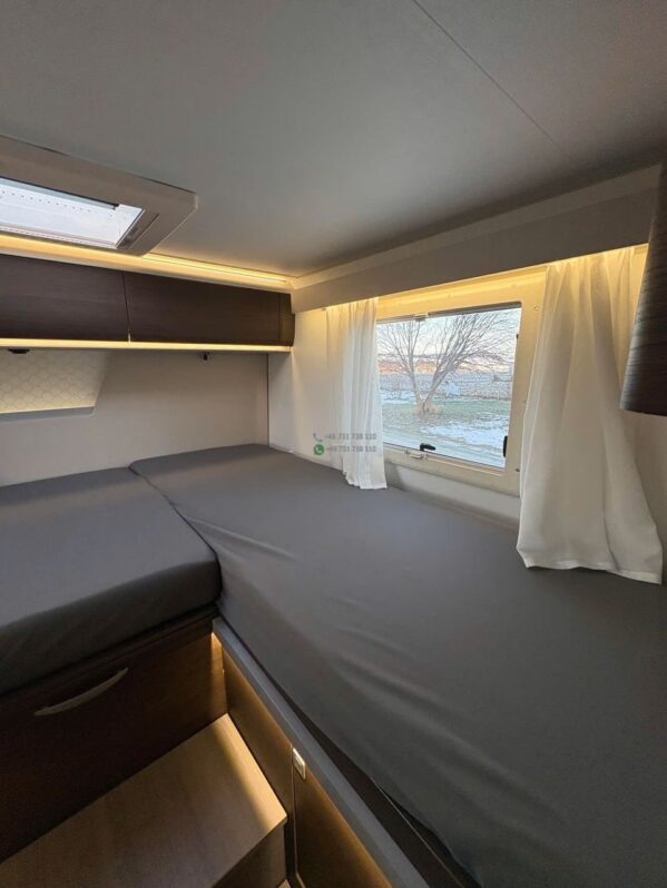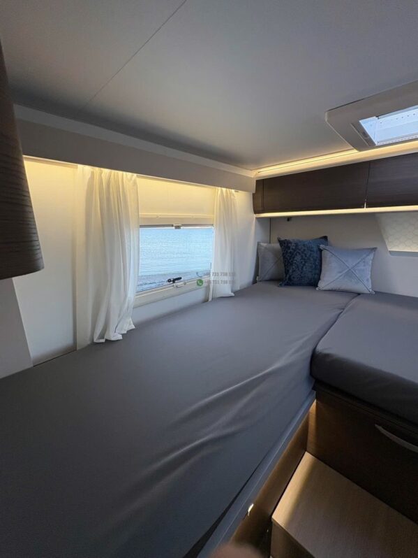 La zone nuit arrière propose un couchage principal confortable (lit central ou lits jumeaux selon version). À l’avant, un lit pavillon double escamotable permet d’obtenir rapidement deux couchages supplémentaires, offrant une capacité totale de 4 couchages.