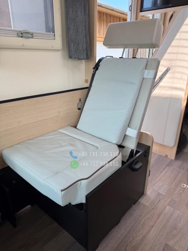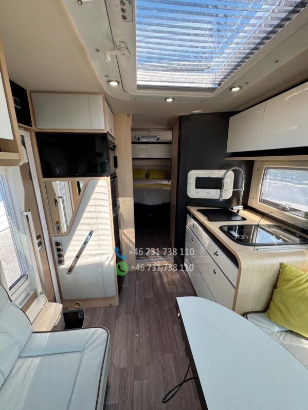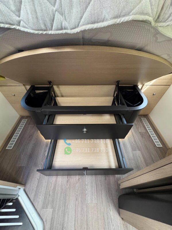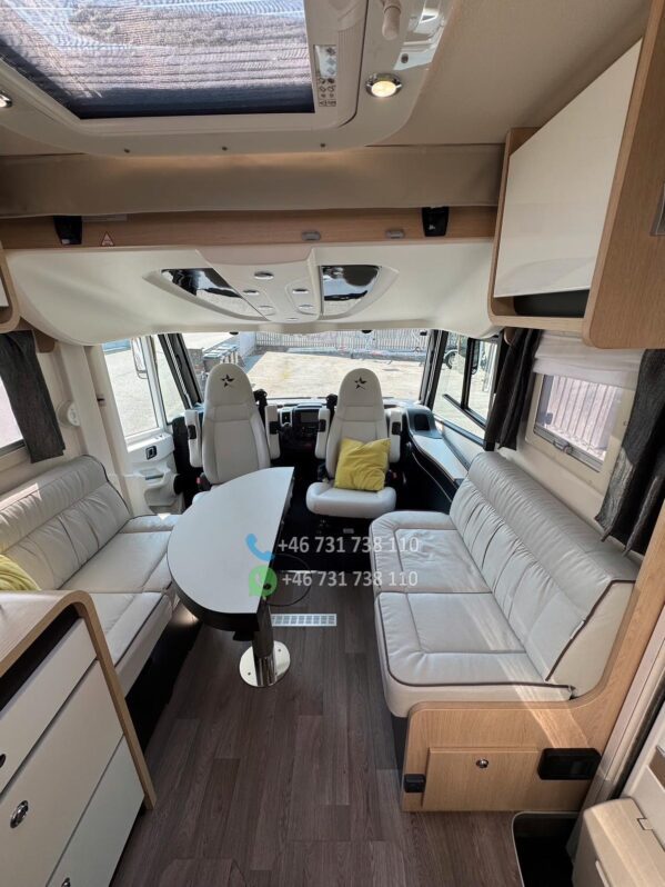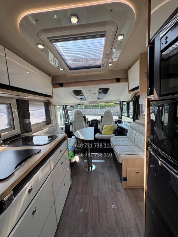 Le salon face-face offre un espace convivial et spacieux, idéal pour les repas ou moments de détente. La table centrale est modulable, et les assises ergonomiques assurent un excellent confort de route comme à l’étape.