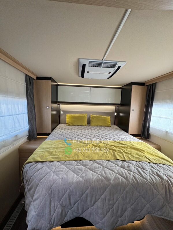 À l’arrière, un lit central confortable avec accès facile des deux côtés, entouré de rangements et penderies. Un second couchage est disponible à l’avant, permettant 4 couchages adultes.