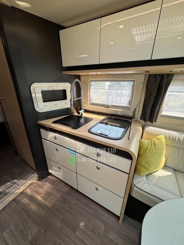 Cuisine fonctionnelle et élégante, équipée de plaques de cuisson, évier, nombreux rangements et d’un réfrigérateur grande capacité, parfaitement adaptée aux longs séjours.