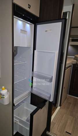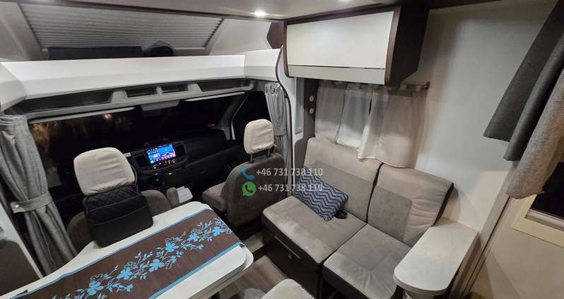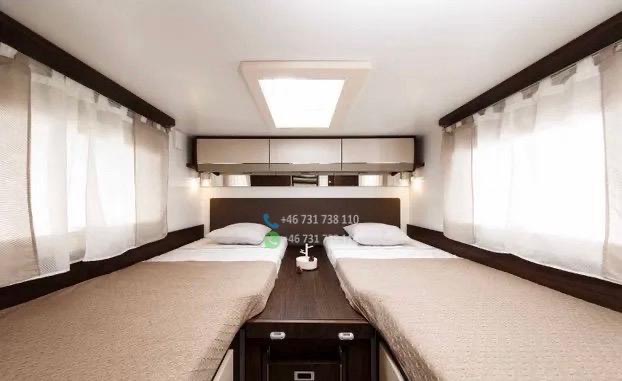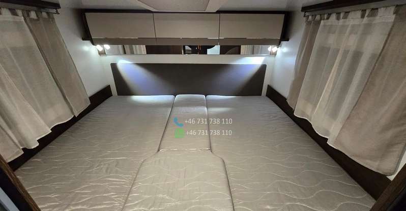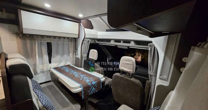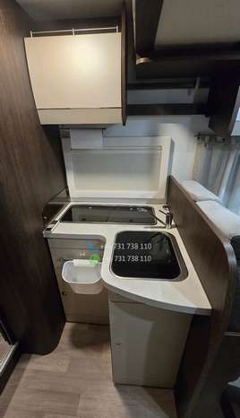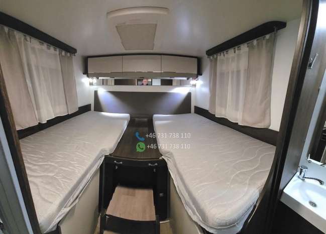 ÉQUIPEMENT : – Climatisation avec télécommande – Machine à café à capsules – Télévision avec télécommande – Réfrigérateur avec congélateur : 140 litres – Cuisinière à gaz trois feux – Table extensible – 2 lits simples : transformables en un grand lit (180 x 210 cm) – 1 lit double : 116 x 212 cm – 2 échelles de lit – Cabine de douche – Salle de bains avec WC – Moustiquaires et stores : à chaque fenêtre – Rideaux : pour les vitres avant et latérales – Stores en aluminium sur les parois latérales – Tapis de sol – Détecteur de gaz : Alarme TriGAS – Éclairage intérieur LED – Prises de courant, ports USB – Store extérieur : 4 mètres – Porte-vélos extérieur : pour 4 vélos – Caméra de recul – Autoradio : grand écran, Android Auto, YouTube – Kit mains libres – Câble électrique – Adaptateur électrique avec 2 prises – Kit de réparation : Fix&Go – Bouteille de gaz de 14 kg : 1 pièce – GASBANK avec prise de recharge pour stations GPL (pas besoin de remplacer la bouteille ; faire le plein en station-service) – Chauffage : gaz Truma – Panneau solaire 140 W – Réservoir d’eau propre : 100 litres – Réservoir d’eaux usées : 120 litres – Cassette sanitaire (WC) – Compresseur mobile petit modèle – Tuyau d’arrosage – Pneus toutes saisons remplacés l’année dernière – Housses de siège sur mesure pour le siège conducteur et les sièges arrière du salon.