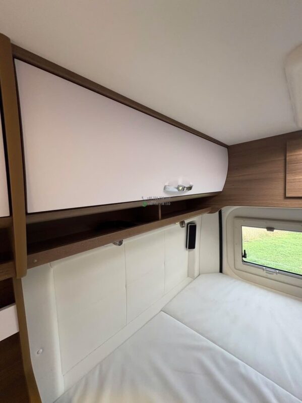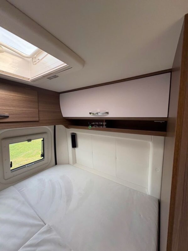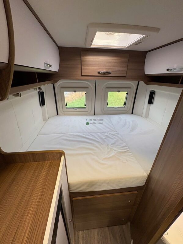 La zone nuit arrière propose un couchage double confortable, avec possibilité d’un couchage complémentaire via la dinette, permettant une capacité totale de 3 couchages.