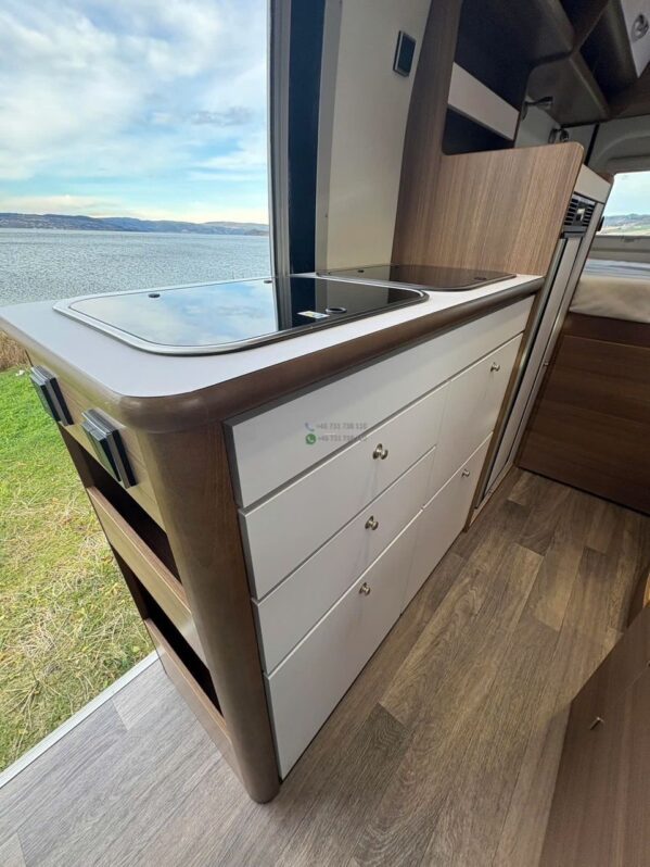 Fourgon compact au design moderne et discret, facilitant la conduite et le stationnement. Construction robuste et isolation performante adaptée aux voyages toutes saisons.
