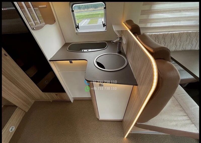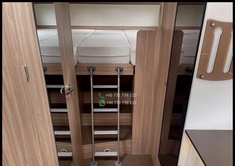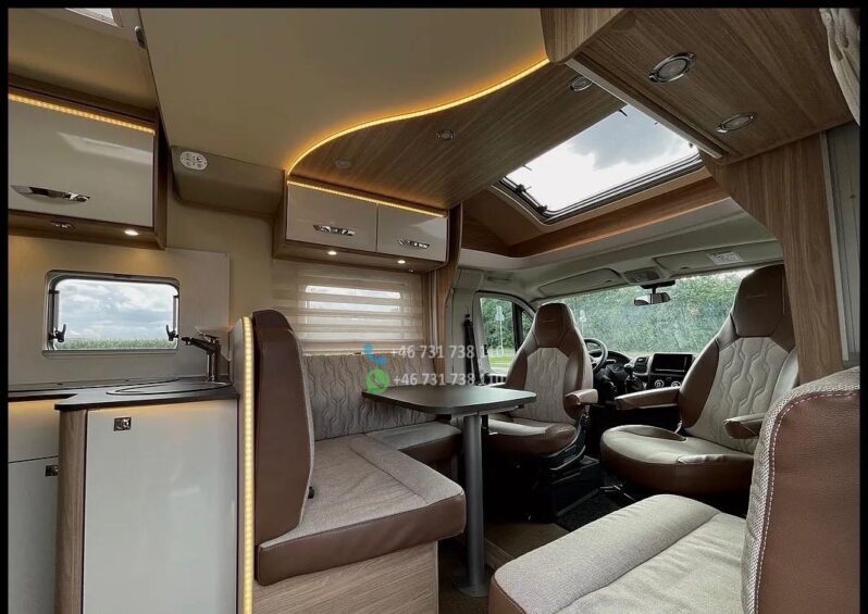 — ABS – ESP – Jantes alliage 16″ – Feux de jour à LED – Régulateur de vitesse – Climatisation – Airbags conducteur et passager – Cabine peinte en noir – Porte-gobelets – Support téléphone – Verrouillage centralisé des portes avant et arrière – Vitres électriques – Rétroviseurs électriques réglables – Portes Premium XL (intégrées) avec vitre de 70 cm – Vitres à cadre aluminium – Portes de coffre des deux côtés – Toit en PRV à sensibilité réduite à la grêle – Plaque de cuisson à gaz 3 feux – Toit ouvrant – Prises 230 V et port USB dans le garage – Réfrigérateur à compresseur 12 V, 142 litres, congélateur 15 litres – Habillage mural latéral dans la cuisine – Éclairage indirect des placards hauts et du plan de travail de la cuisine – Éclairage mural au-dessus du lit – Éclairage LED dans le store extérieur – Réservoir d’eau de 120 litres – Réservoir d’eaux usées de 90 litres – Batterie intégrée AGH 95 Ah – Autoradio multimédia Pioneer avec aide à la marche arrière Caméra – Fenêtre de toit 50×70 cm dans le séjour – Fenêtre de toit 40×40 cm dans la salle de bain et la chambre – Porte-vélos Thule pour 4 vélos – Câblage pour climatisation et panneaux solaires