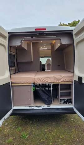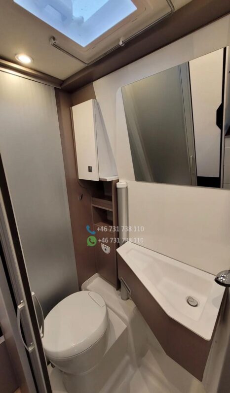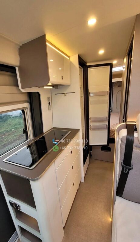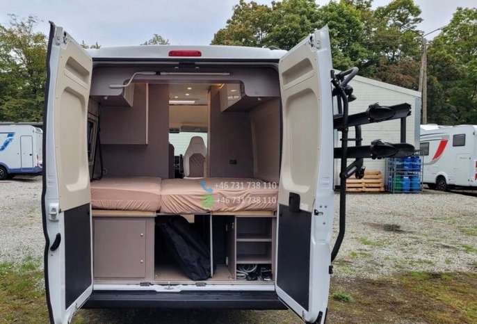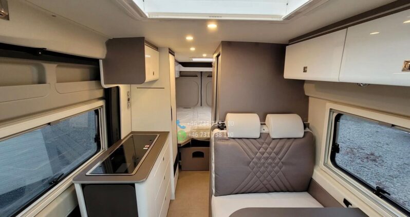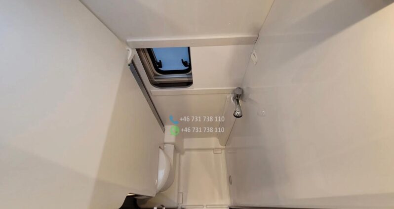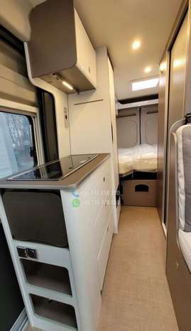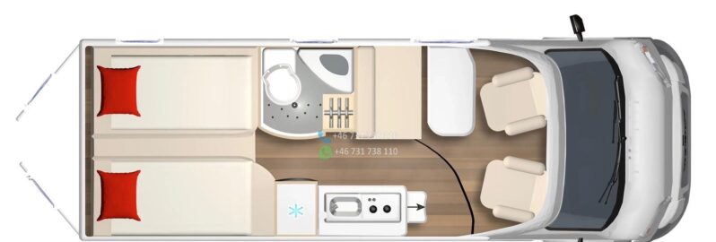 VÉHICULE ESP, ASR et assistance au démarrage en côte ABS Feux de jour Kit de réparation de pneus Réservoir de carburant – 75 L Système Start-Stop CABINE Sièges de cabine avec sellerie type camping-car Stores plissés pour les vitres de cabine Airbags conducteur et passager Sièges avant pivotants Sièges conducteur et passager réglables en hauteur Porte-gobelets Verrouillage centralisé et vitres électriques Climatisation manuelle FINITION EXTÉRIEURE Peinture blanche Fenêtres type camping-car avec cadres en aluminium Fenêtre de toit dans la chambre (40 x 40 cm) Fenêtre de toit dans la salle de bain (40 x 40 cm) Fenêtre de toit au-dessus de la table (50 x 70 cm) Fenêtre latérale dans la salle de bain Fenêtre latérale gauche dans la chambre. AMÉNAGEMENTS INTÉRIEURS Deux lits séparés à l’arrière, convertibles en un grand lit Marchepied pour un accès facile au lit Table avec plateau pivotant Quatre barres d’appui au sol Deux fixations Isofix Matelas en mousse à froid à zones de fermeté différentes Placage Bahia Assise de table inclinable CUISINE Plan de travail extensible supplémentaire Réfrigérateur à compresseur de 138 l avec compartiment congélateur de 12 l Plaque de cuisson deux feux avec couvercle en verre et évier intégré SYSTÈME D’EAU Douche WC à cassette Réservoir d’eau propre de 100 l Réservoir d’eaux usées de 90 l