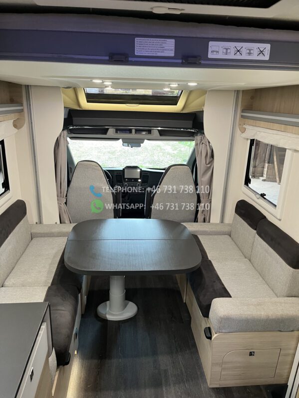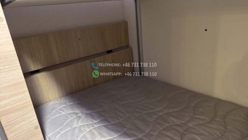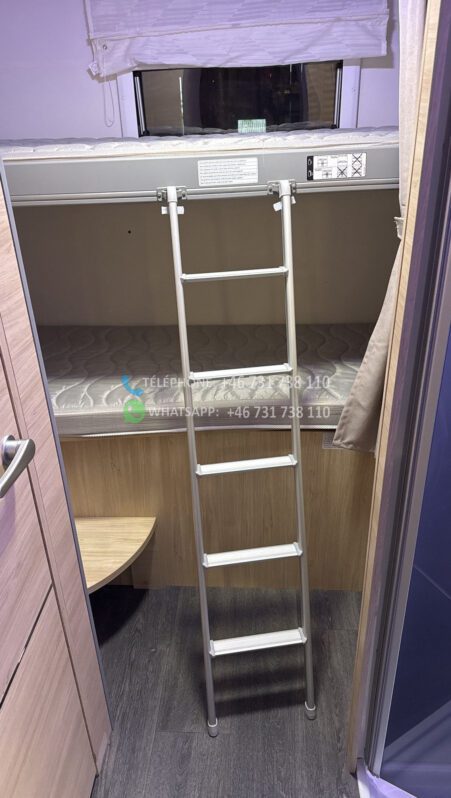 En mode nuit avec sa chambre séparée équipée de lit superposé donc le lit du haut peut se monter au plafond électriquement et aussi un grand lit pavillon de 160 à l’avant.