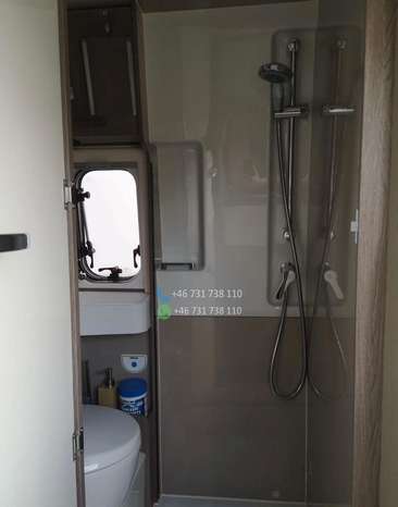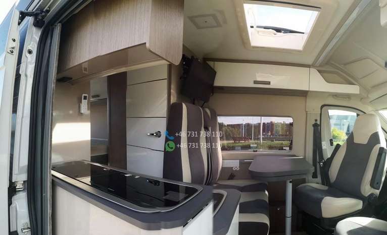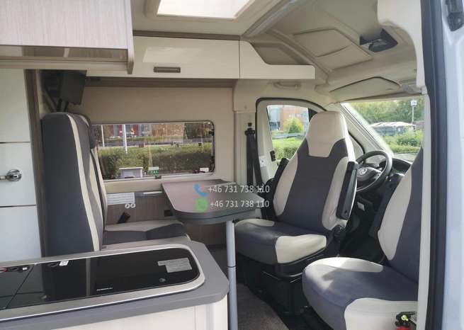 Pack Accessoires : store extérieur / auvent, panneau solaire, éclairage extérieur à la porte d’entrée, moustiquaire de porte, store intérieur cabine, compléments couchage dinette / lits jumeaux, kit pose 2ᵉ batterie.