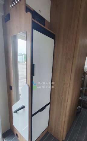 Cuisine : évier + plaques de cuisson (souvent 3 feux), réfrigérateur trivalent (12V / 230V / gaz) d’environ 135‑140 L. Salle de bain avec douche séparée ou combinée selon les versions, WC chimique ou autre solution mobile.