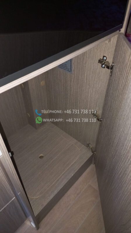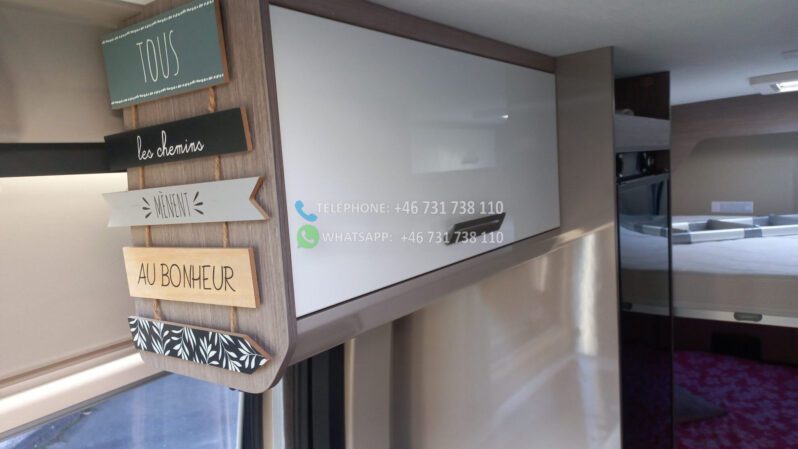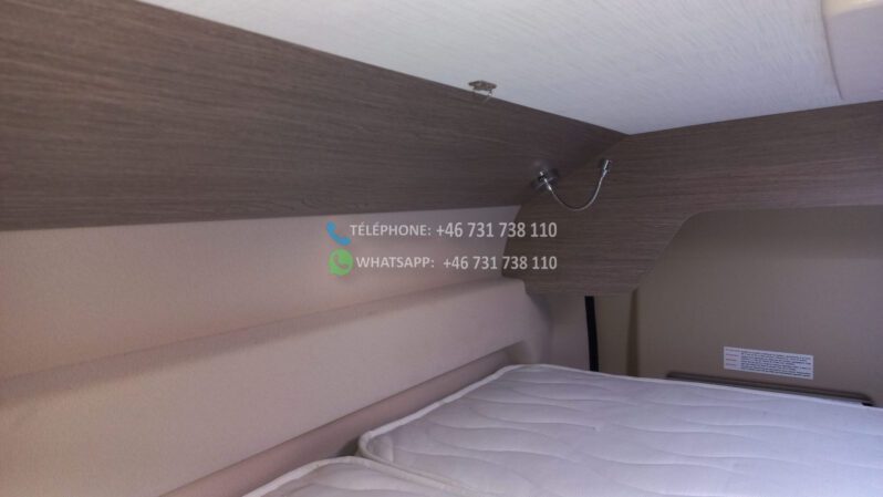 2 grands lits superposés / modulable : le lit du haut peut être supprimé, ou adapté en 1 seul matelas, ou transformé en plateforme bagages (très pratique à l’usage)