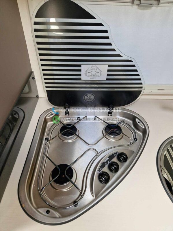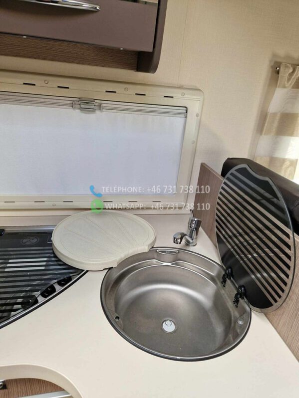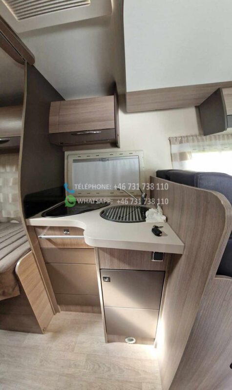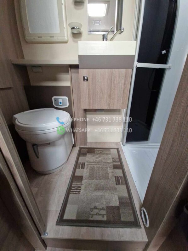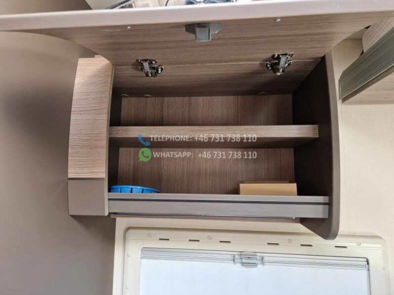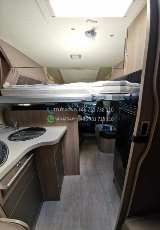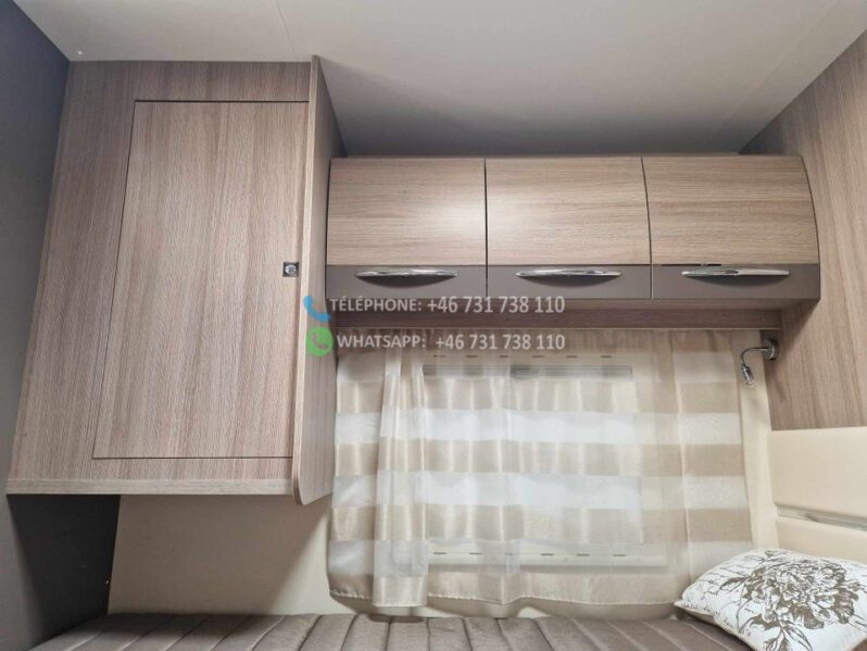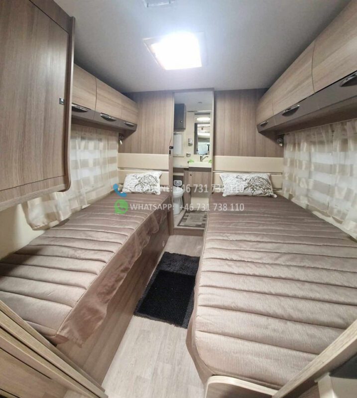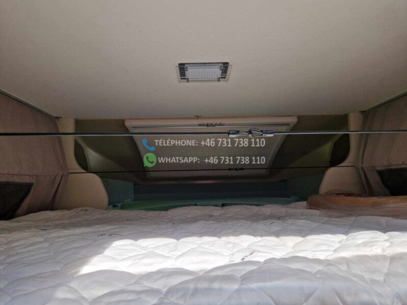 2 lits simples et grande salle de bain à l’arrière avec WC séparés et cabine de douche. Grand lit escamotable au dessus du coin salon. La table peut être abaissée et le salon peut être transformé en lit. Bon rangement sous les lits avec accès par l’extérieur. Grand réfrigérateur avec congélateur séparé. Téléviseur Finlux avec DVD. Aspirateur rechargeable. Chauffage au sol 230 V. Autre chauffage Truma diesel / 230 V. Tapis extra épais à l’avant.