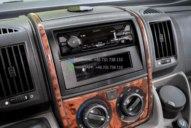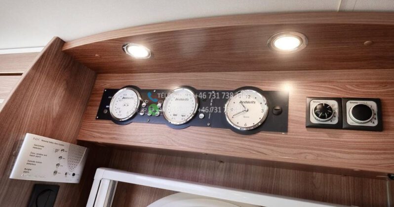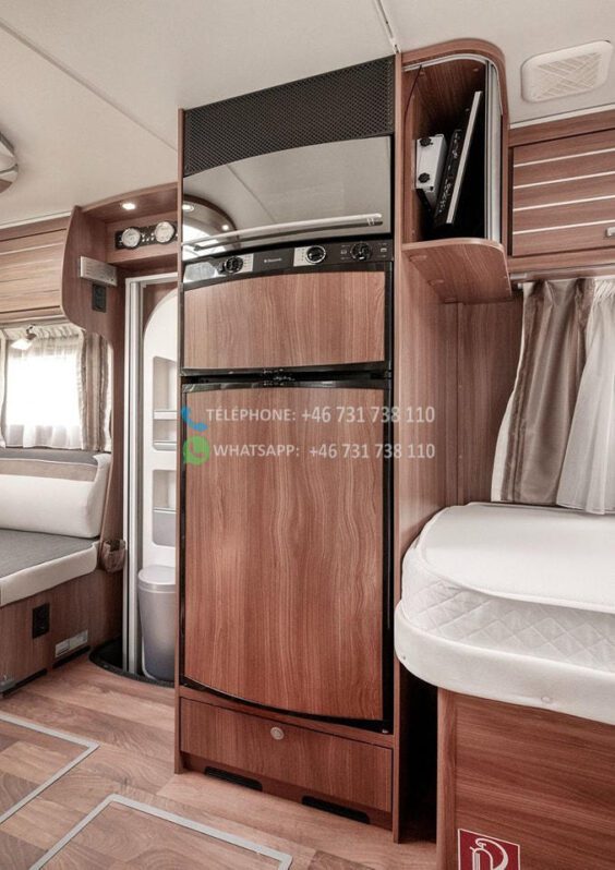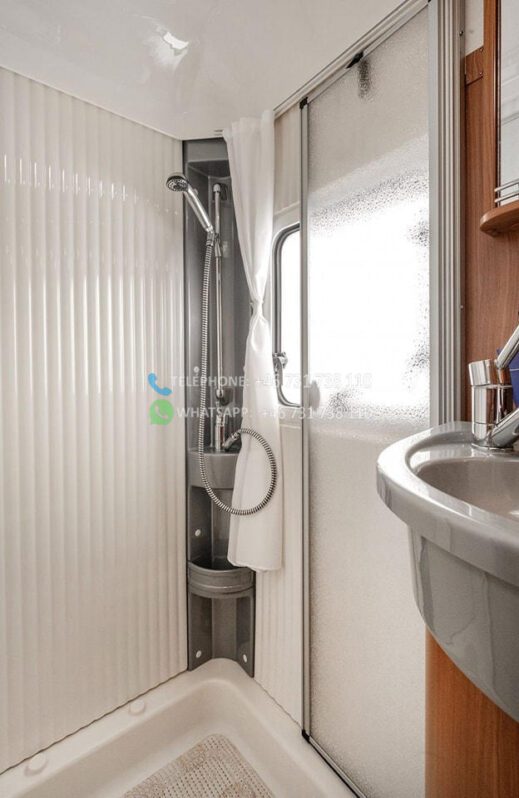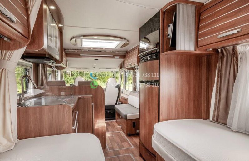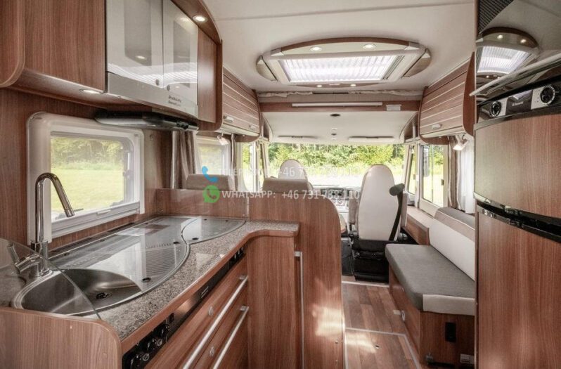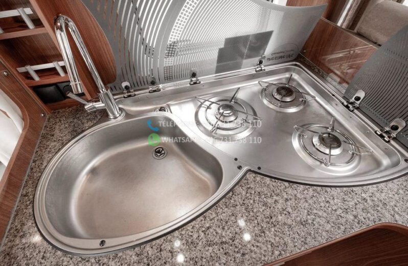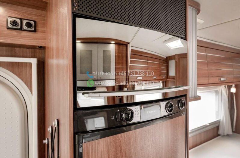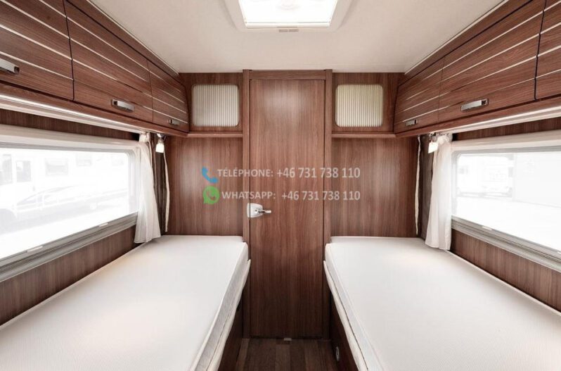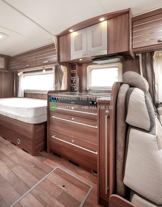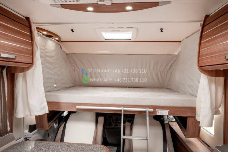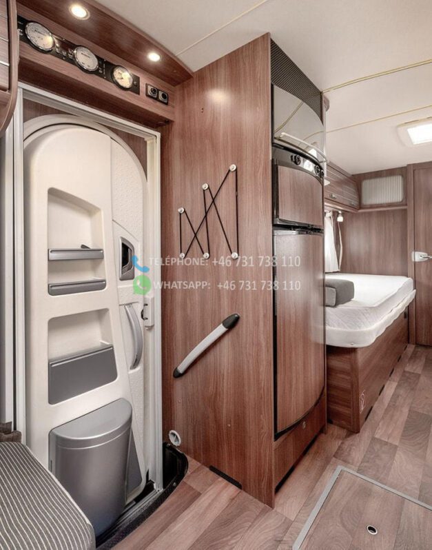 Dès l’ouverture de la porte, vous serez accueilli par un intérieur chaleureux et accueillant avec des boiseries brun doré et des détails argentés qui caractérisent tout le design du camping-car. La solution ouverte donne une sensation d’espace et d’accueil, où le bois brun élégant rencontre des éléments modernes détaillés en argent et en noir. Les coins salon sont équipés de coussins confortables dans des tons marron-beige-gris avec des détails rayés, et la table à manger réglable vous offre flexibilité et confort pour tous vos repas.