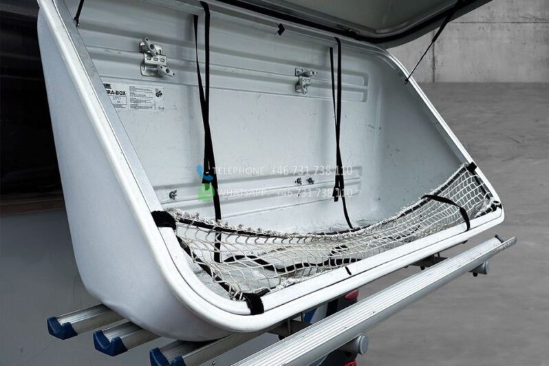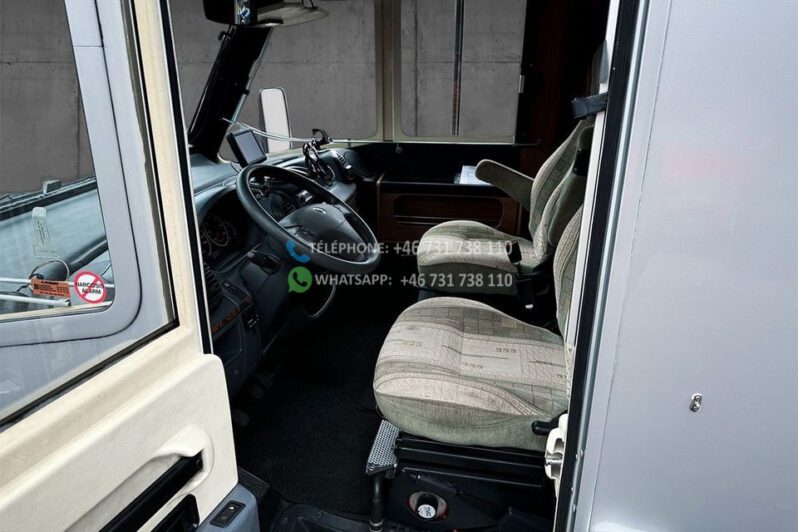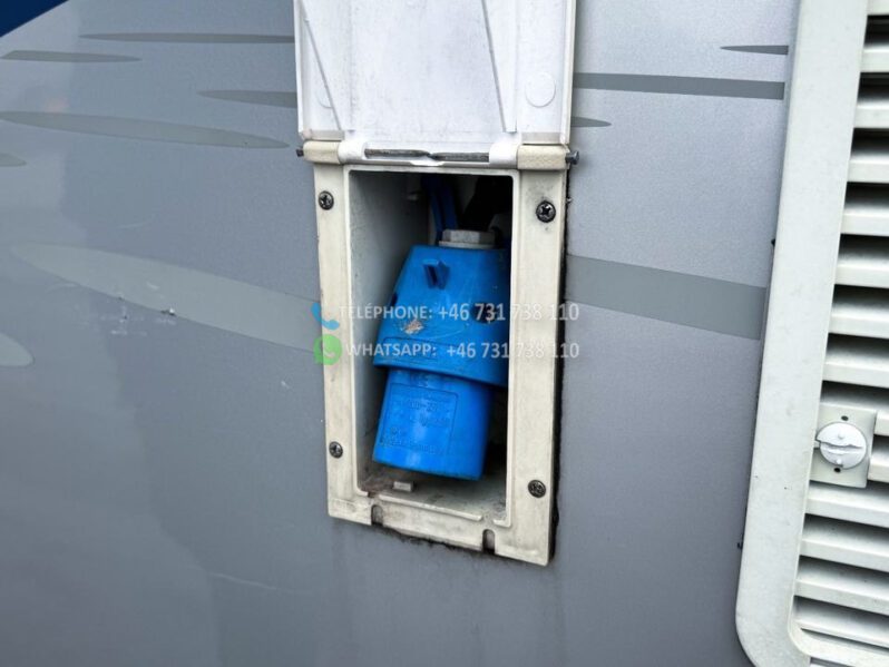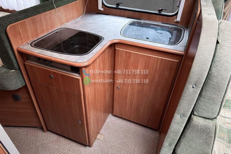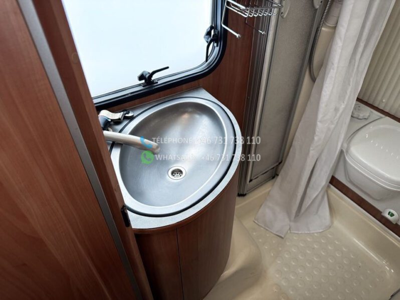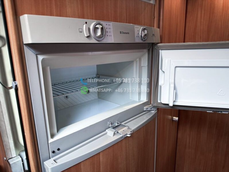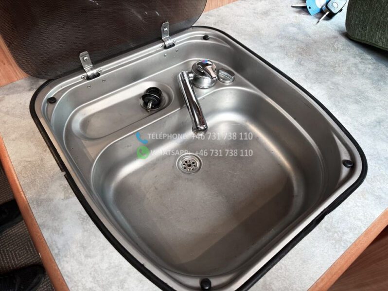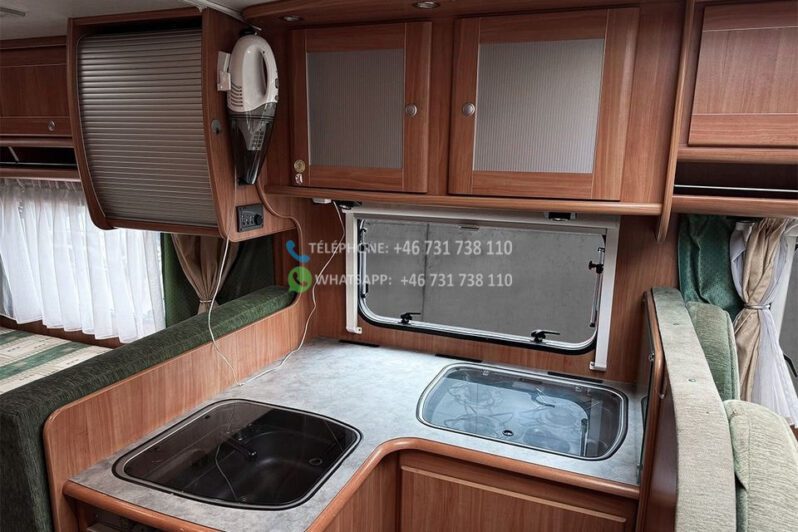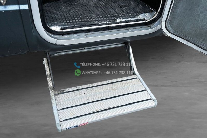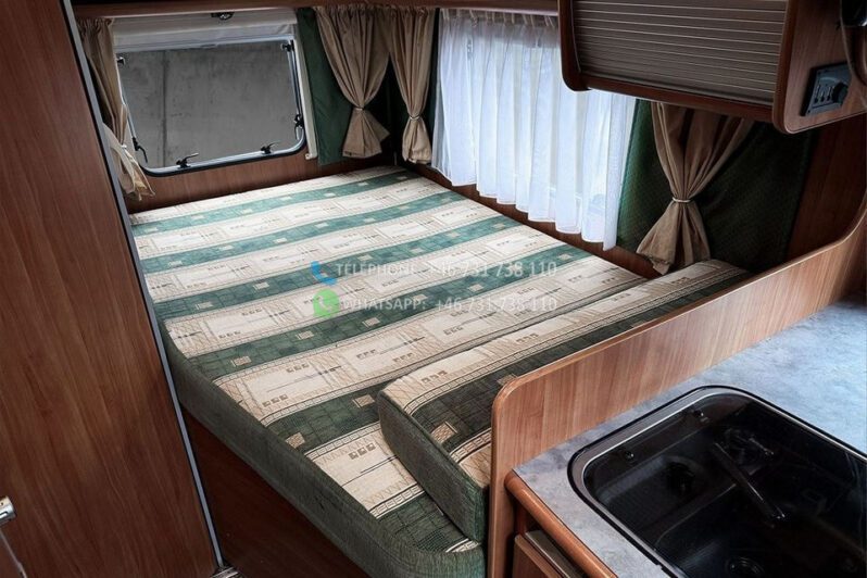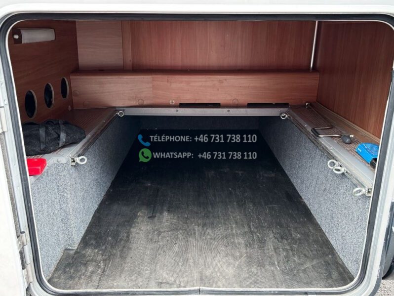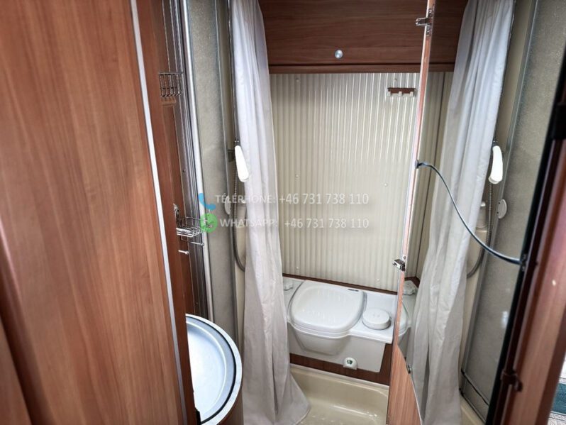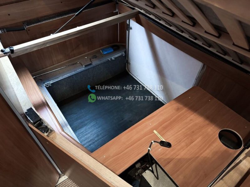 Échelle – Télévision – Réfrigérateur/congélateur – Lit double côte à côte et lit escamotable devant le coin salon – Salle de bain compacte avec douche et WC – Enregistré comme 4 places avec 6 couchages !