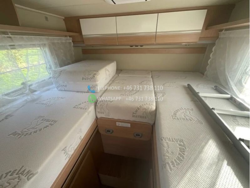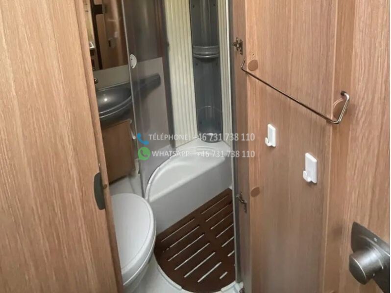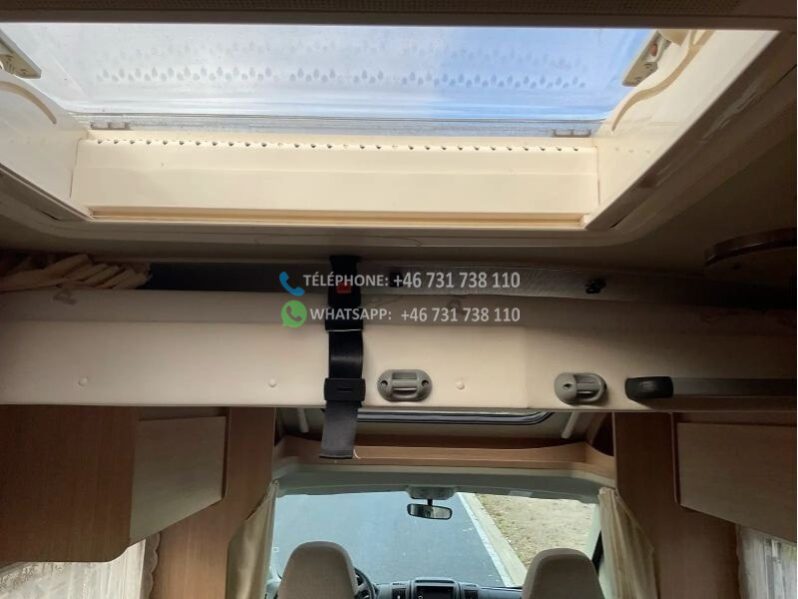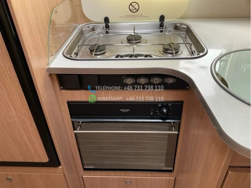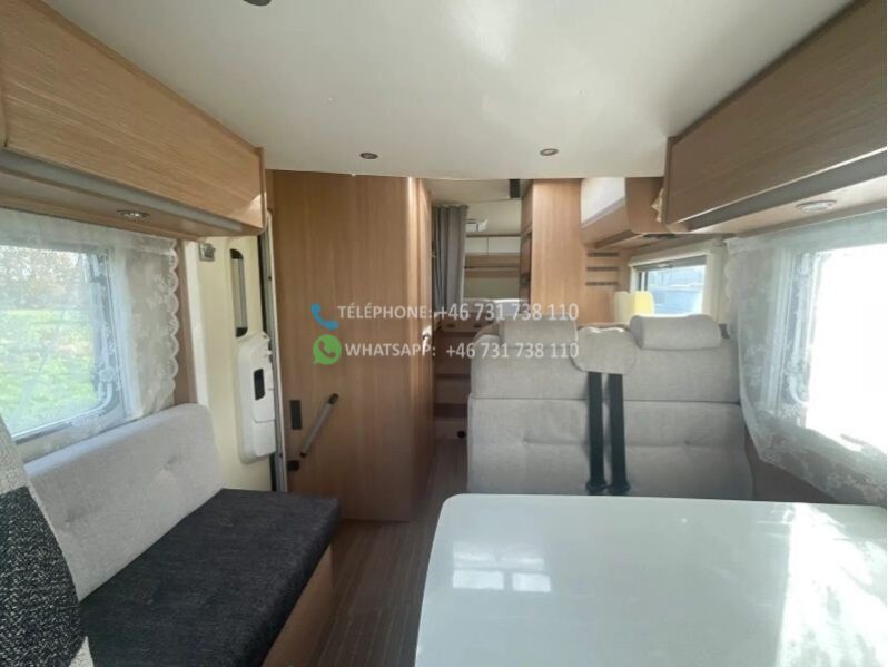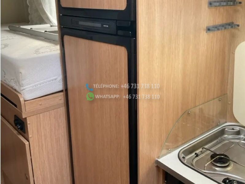 sièges avant pivotants; 2 lits simples; Lit escamotable 2 personnes; cuisine; réfrigérateur, 167 litres; chauffe-eau au gaz; cuisinière à gaz 3 feux; store; climatisation au plafond; régulateur de vitesse