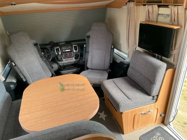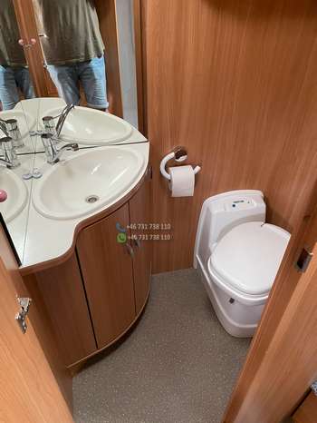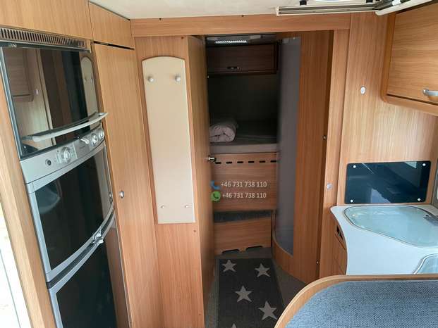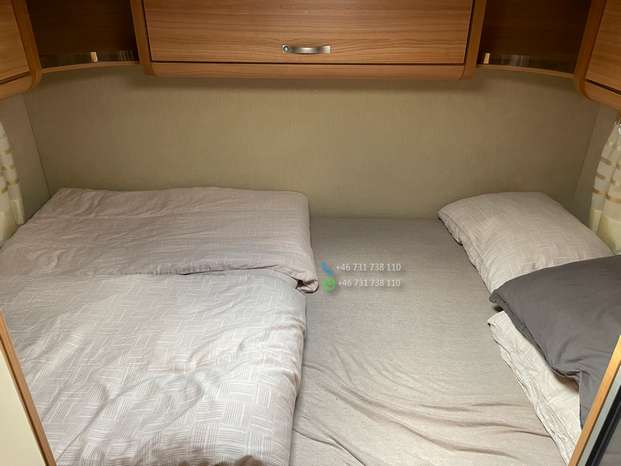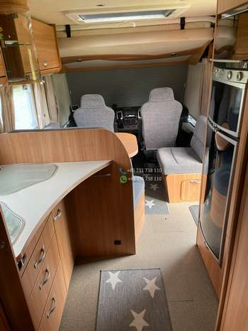 Un double plancher et d’un chauffage au sol à eau Alde avec échangeur de chaleur pour le moteur, d’un panneau solaire, d’une alarme gaz NX-5, d’un auvent neuf de 5 mètres avec éclairage LED sur toute la longueur, d’un store électrique dans le pare-brise, d’un téléviseur encastré dans la banquette du coin salon, d’un système satellite, d’un réfrigérateur avec congélateur séparé, d’un four, d’une douche séparée, d’une aspiration dans les toilettes, de roues hiver sur jantes en acier, d’un attelage de remorque, de pneus été. est d’humidité approuvé