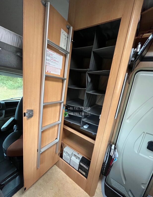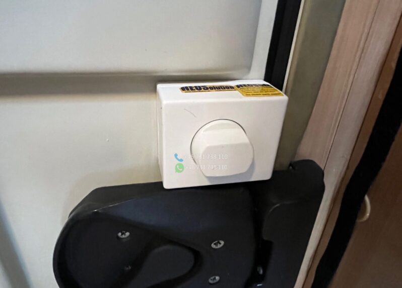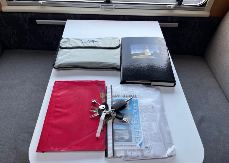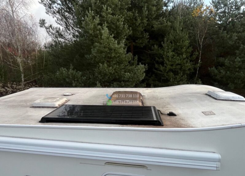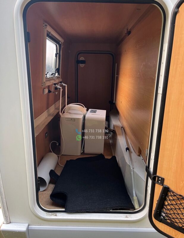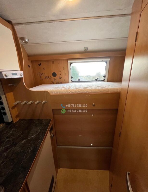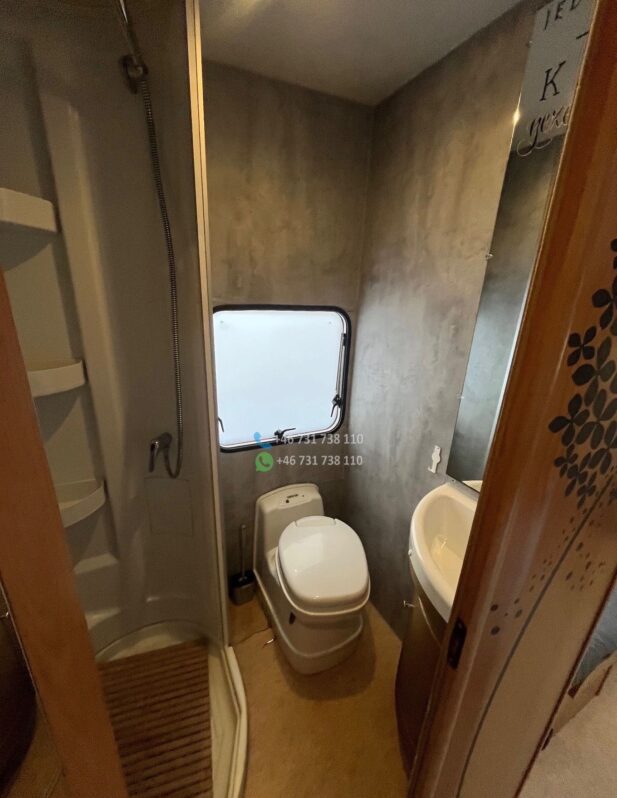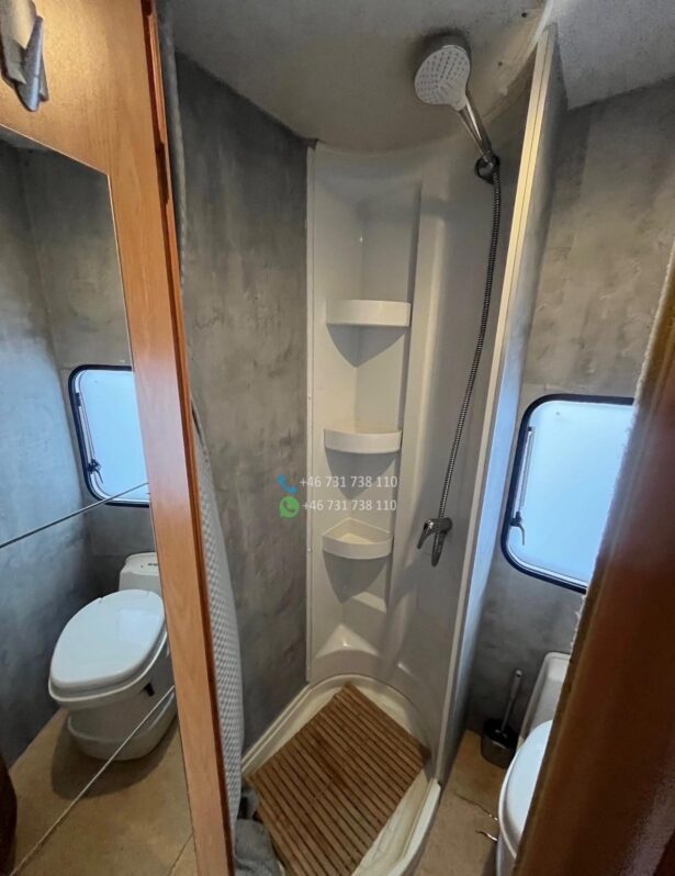 Le véhicule est équipé de la clim cabine, du chauffage cellule, d’un réfrigérateur tri-mixte, d’une salle de bain avec douche et WC, d’un store extérieur et de lits superposés très pratiques pour les enfants.