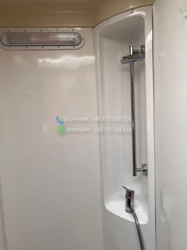 Les toilettes et la douche sont séparées, ce qui est à la fois pratique et crée une bonne sensation d’espace. La salle d’eau dispose d’un WC, d’un lavabo, d’un miroir et de rangements. La douche est grande et spacieuse.