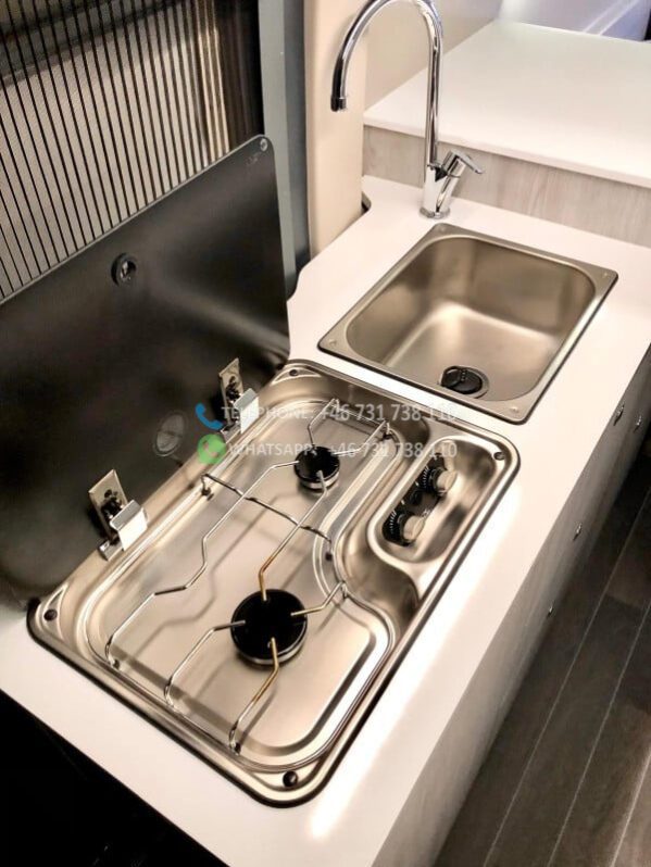 Cuisine équipée (réfrigérateur, feux gaz, évier, rangements)