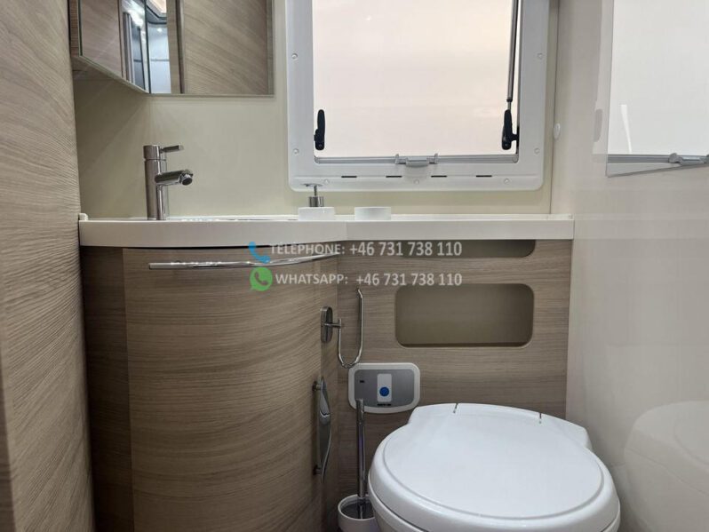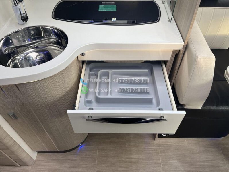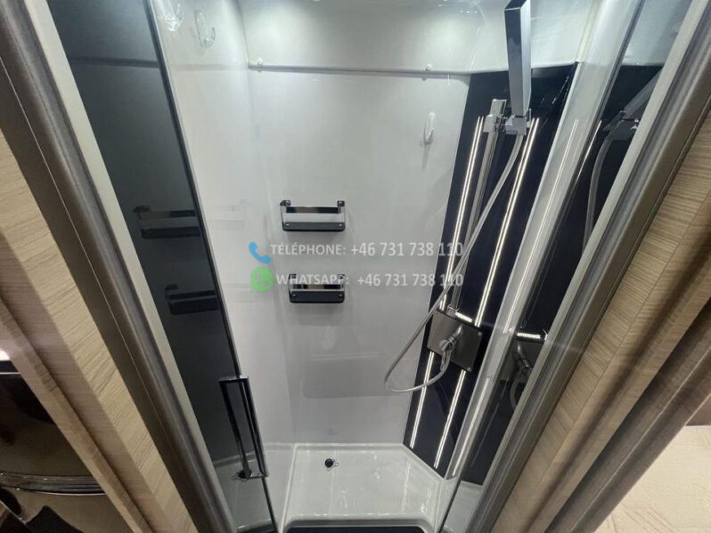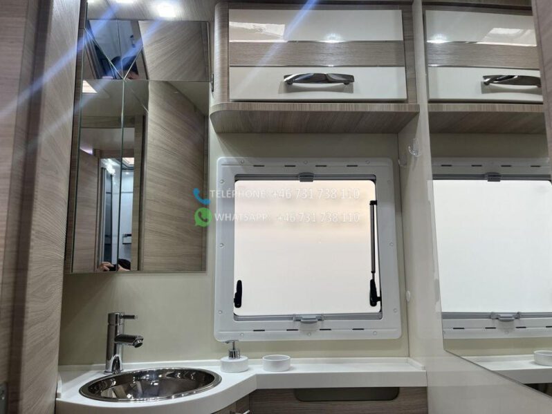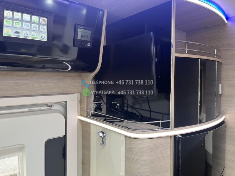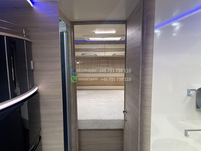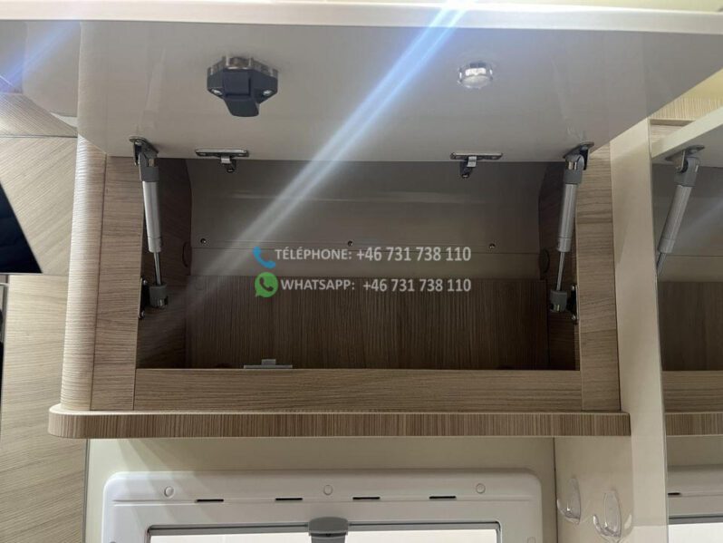 Grand lit queen/double confortable avec possibilité de le soulever et de l’abaisser pour augmenter la hauteur de l’espace de chargement. Armoires suspendues de chaque côté du lit, grandes armoires suspendues au-dessus du lit et trappes supplémentaires dans les marches menant au lit pour ranger des objets plus petits. Éclairage indirect élégant, éclairage nocturne bleu, celui-ci est séparé de tous les autres éclairages.