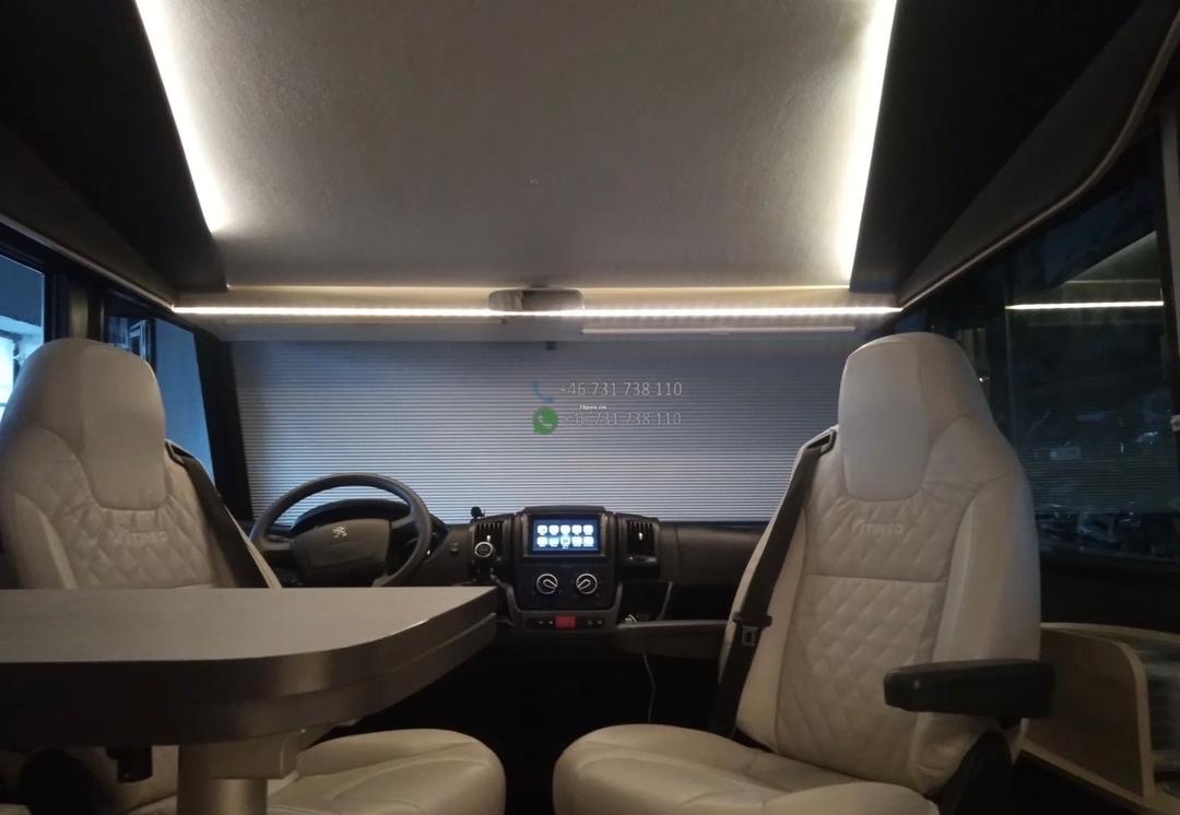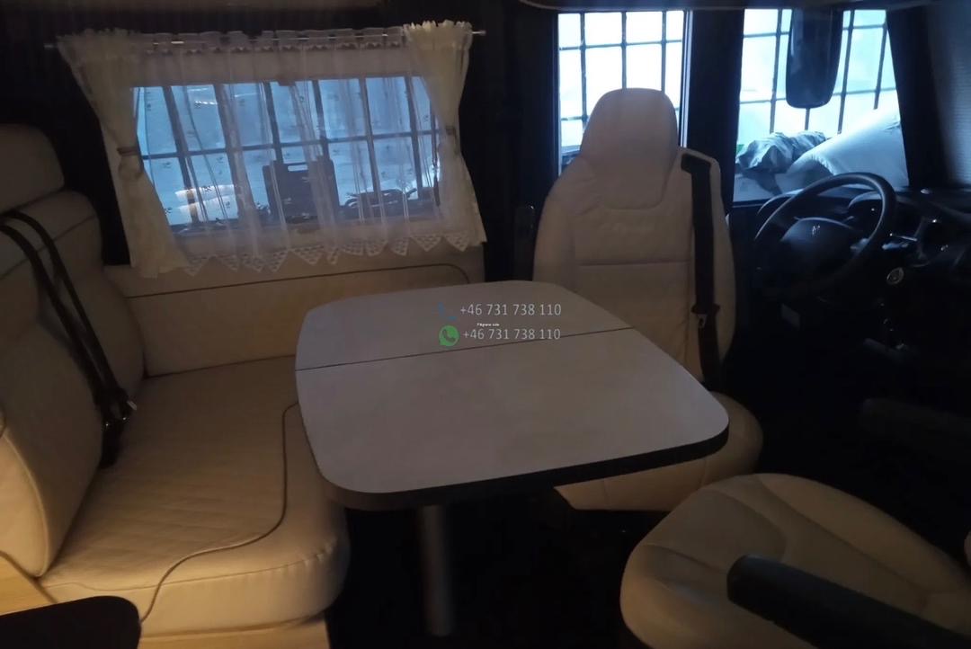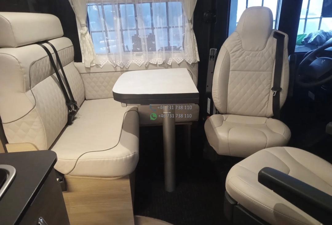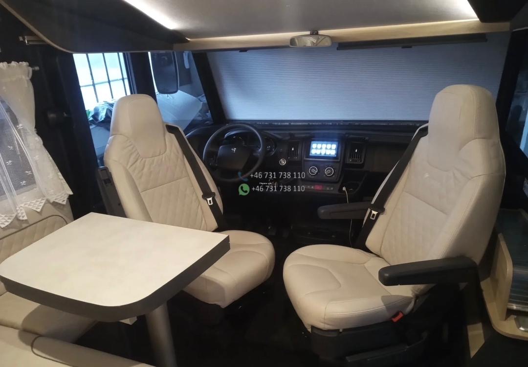 L’Itineo intégral offre un intérieur spacieux et lumineux grâce à sa large baie frontale. Le salon face-face avec sièges cabine pivotants crée un véritable espace de vie convivial.