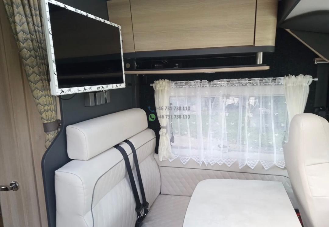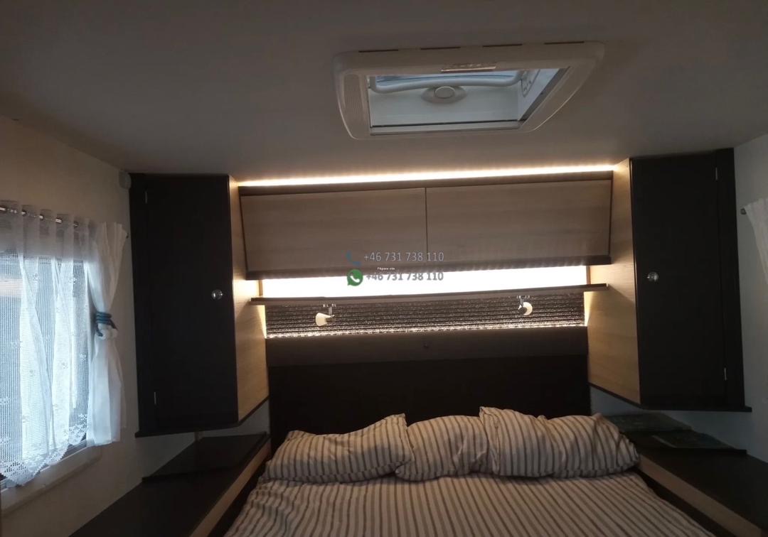 La zone nuit arrière propose généralement un lit central ou lits jumeaux selon version. À l’avant, un lit pavillon double escamotable permet d’obtenir deux couchages supplémentaires, offrant un total de 4 couchages confortables.