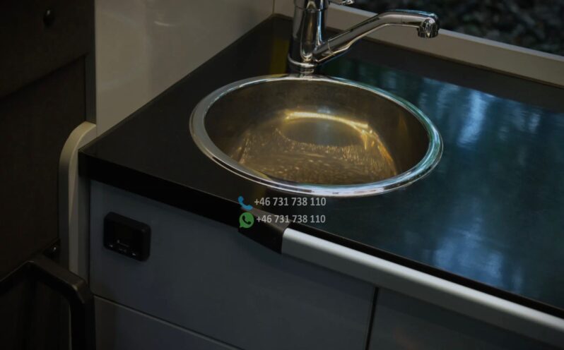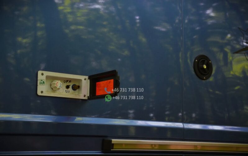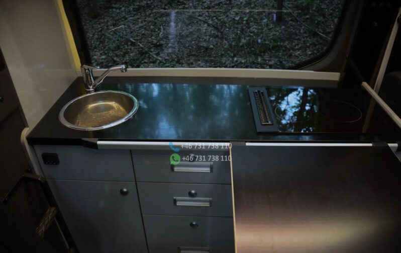 Ce camper van bénéficie d’un aménagement camping-car professionnel unique avec un immense garage de 3,3 mètres de profondeur, parfait pour transporter jet-ski, motos, quad, matériel sportif ou professionnel.