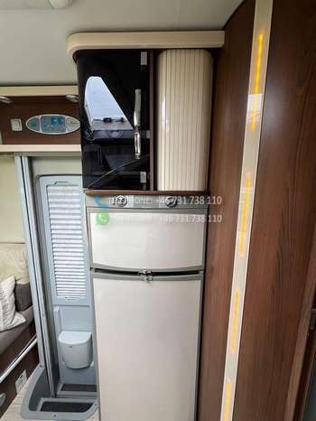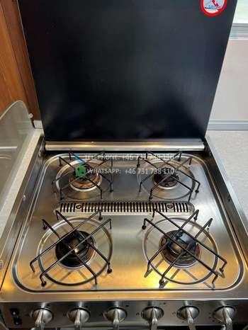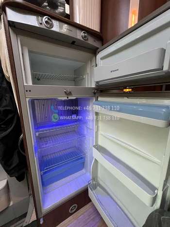 Grand réfrigérateur avec congélateur séparé fonctionnant au gaz, à batterie et 230V. Plaques de cuisson au gaz.