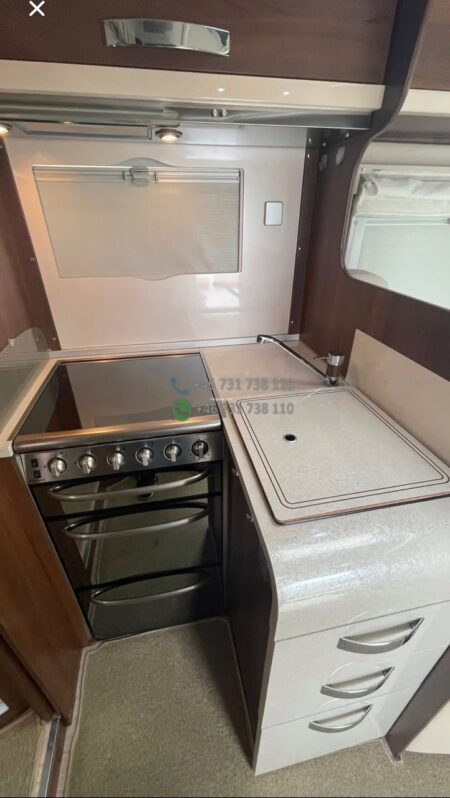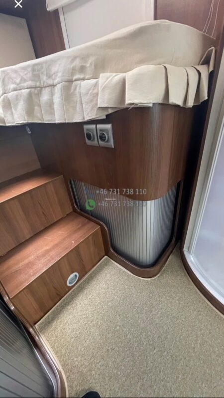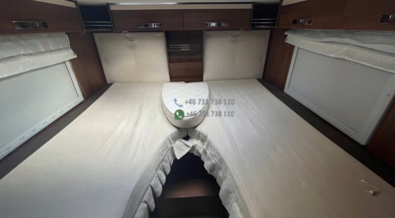 La zone nuit arrière offre un couchage principal confortable (lit central ou lits jumeaux selon implantation exacte). À l’avant, un lit pavillon double escamotable permet d’obtenir rapidement les couchages supplémentaires pour atteindre 4 couchages réels.