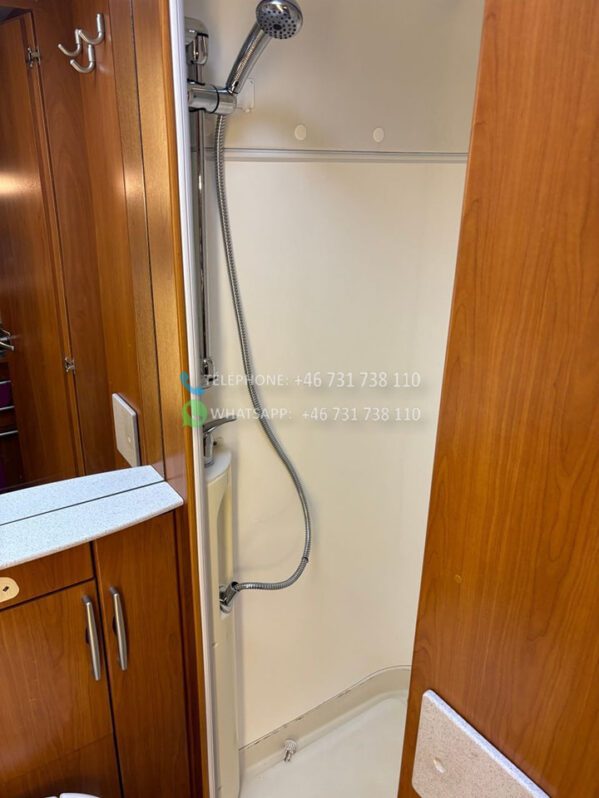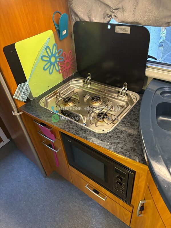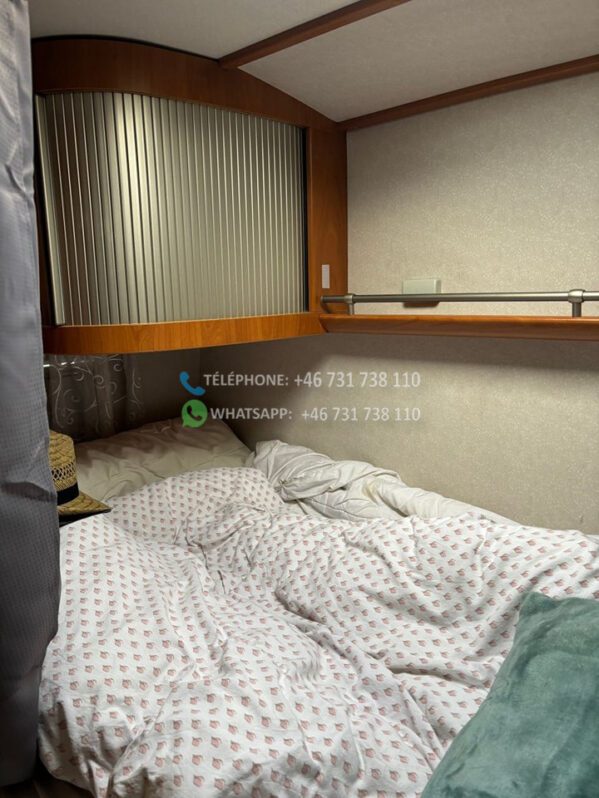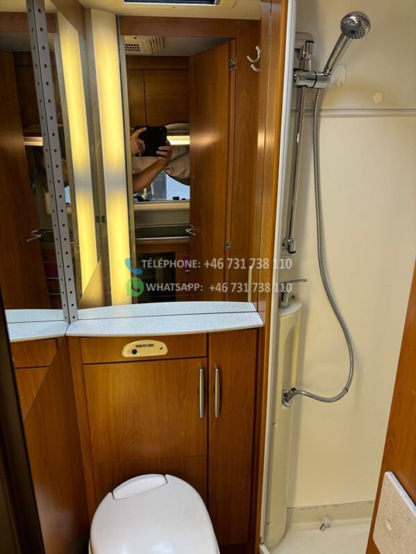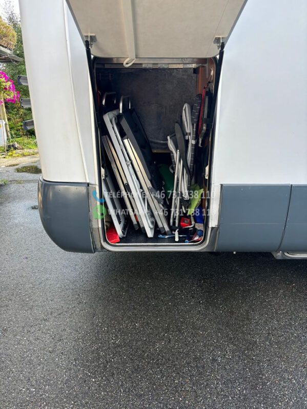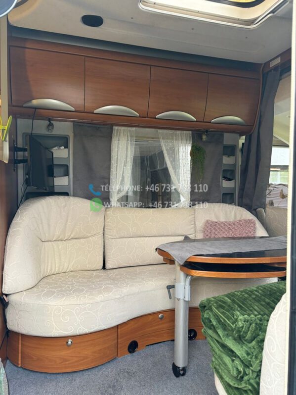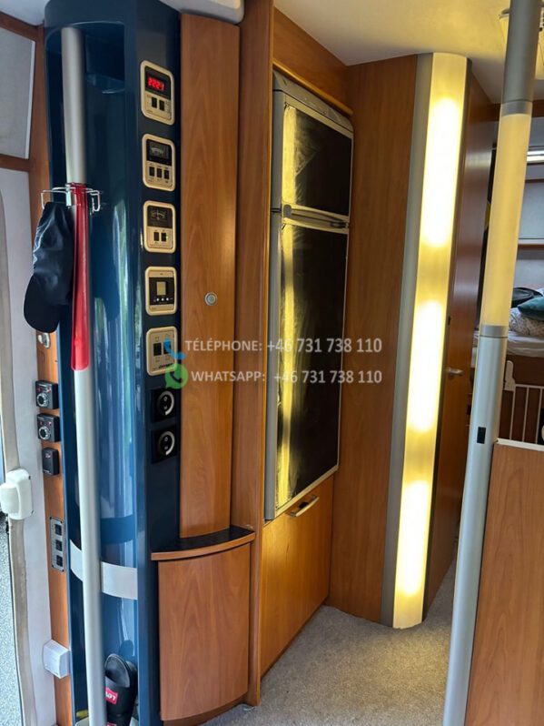 A l’intérieur de la voiture, il y a des tiroirs sous les banquettes et une rangée d’armoires au dessus du salon + une longue étagère et des tiroirs à l’arrière.