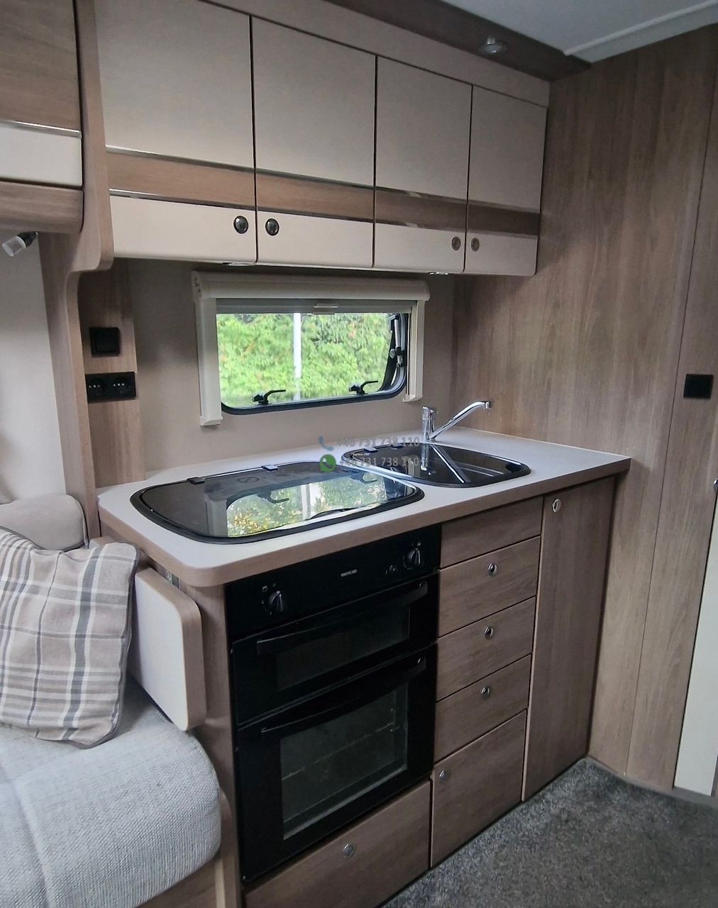 La cuisine latérale est bien équipée avec feux gaz, évier et réfrigérateur, accompagnée de nombreux rangements pratiques.