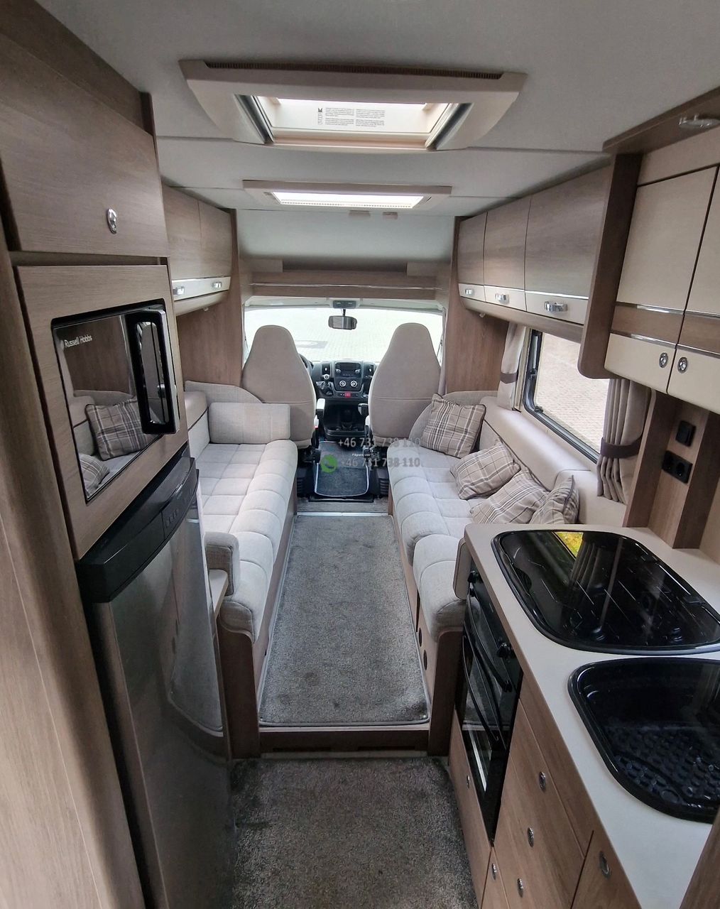 L’intérieur offre un espace optimisé et fonctionnel. Le salon avant avec sièges pivotants permet de créer un espace convivial pour les repas ou la détente.