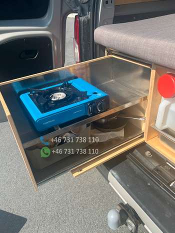 Mini camping-car agréable et bien entretenu. Espace de couchage pour deux personnes. Livré avec une plaque de cuisson, un réservoir d’eau et un réfrigérateur.