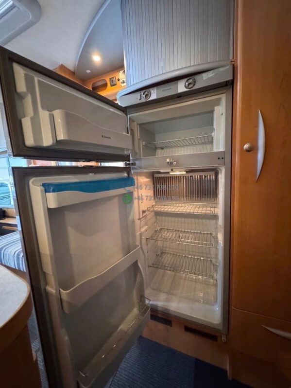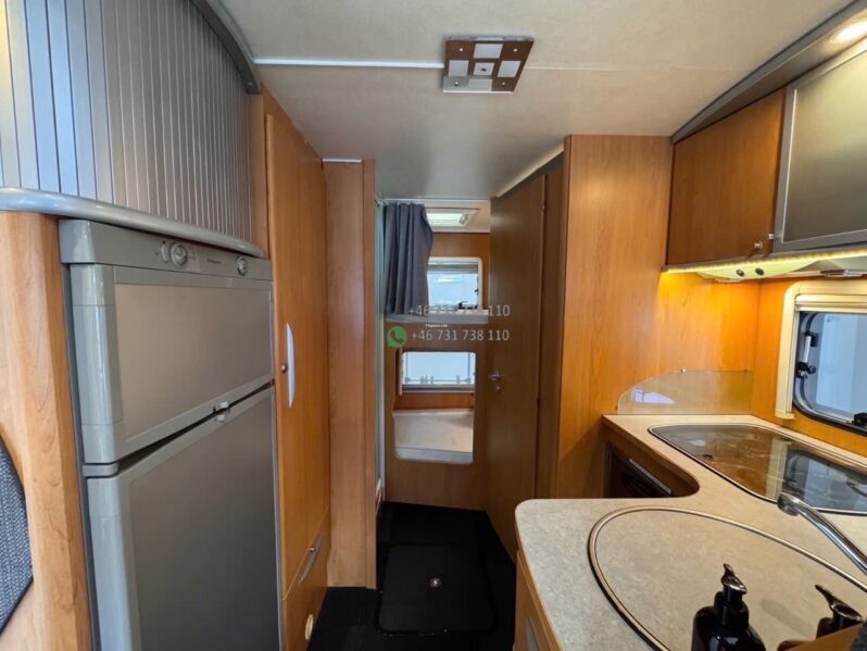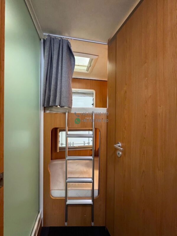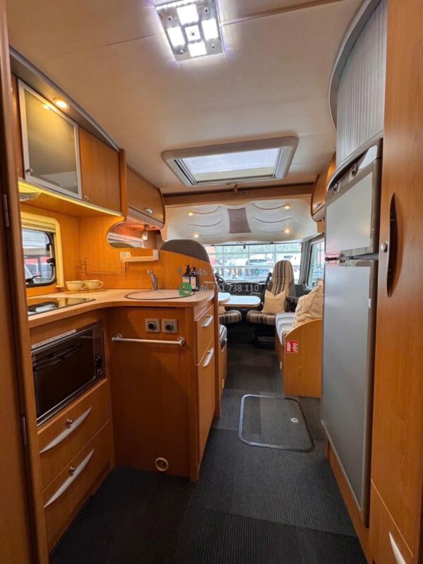 La zone nuit comprend un couchage principal arrière confortable (implantation lit central ou transversal selon configuration exacte) ainsi qu’un lit pavillon double escamotable à l’avant. Les 4 couchages sont réels et rapidement disponibles.