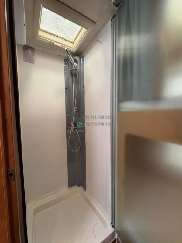 La salle d’eau est compacte mais complète avec douche, lavabo et WC, pensée pour un usage voyage.