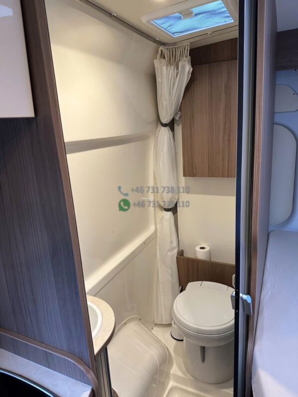 La salle d’eau compacte intègre douche, WC cassette et lavabo, avec ventilation et rangements dédiés.