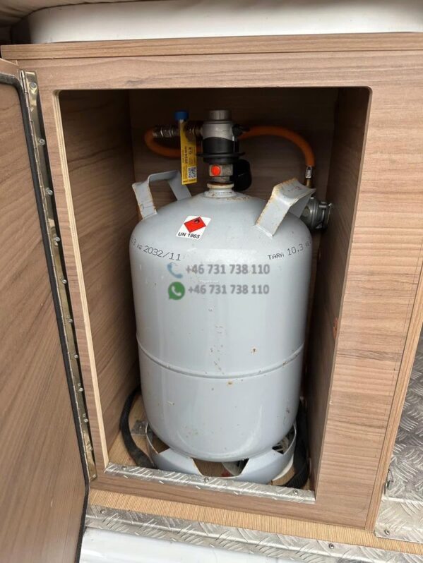 La cuisine latérale est fonctionnelle avec plan de travail, rangements hauts et bas, plaque gaz et réfrigérateur, idéale pour cuisiner en voyage.