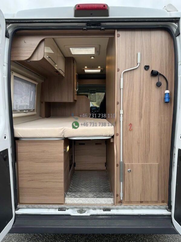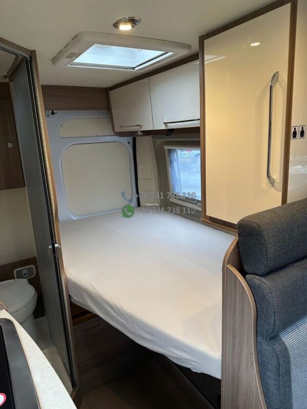 L’espace nuit propose un couchage double confortable, avec sommier et matelas adaptés aux séjours prolongés. Rangements en soute et placards pavillon pour optimiser le chargement.