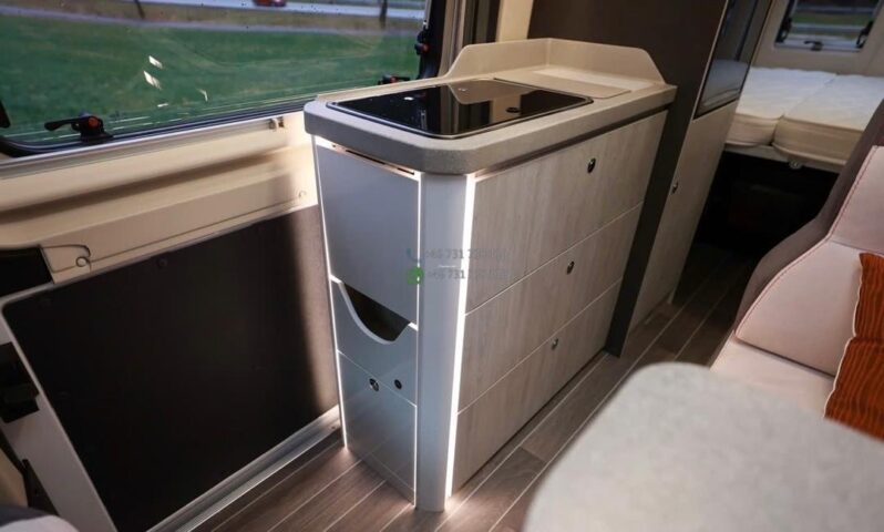 La cuisine latérale est pratique et bien équipée : feux gaz, évier, réfrigérateur et rangements multiples pour une utilisation quotidienne en voyage.