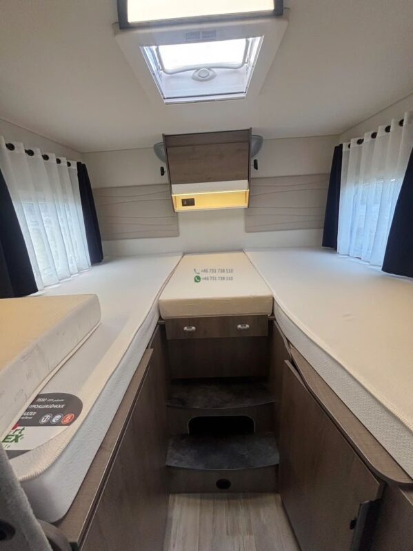 La zone nuit arrière dispose de lits jumeaux longitudinaux (E) offrant un excellent confort. Une extension permet de créer un grand couchage double. Un couchage supplémentaire est disponible via la transformation de la dinette ou lit pavillon selon configuration, permettant d’accueillir jusqu’à 4 couchages.