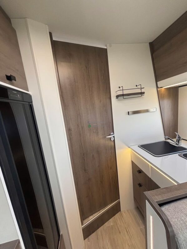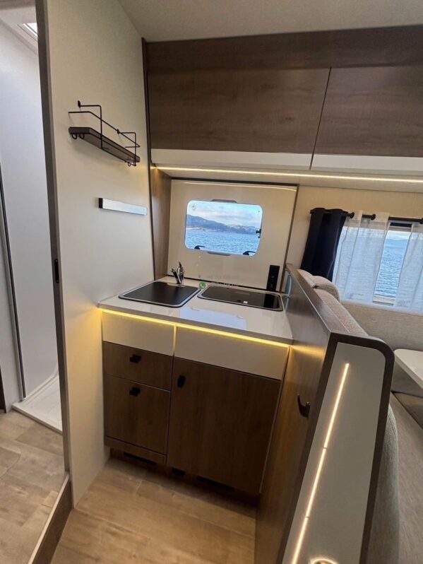 La cuisine centrale est ergonomique avec plan de travail fonctionnel, feux gaz, évier et réfrigérateur, accompagnée de nombreux rangements adaptés aux longs séjours.