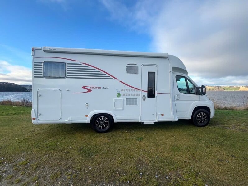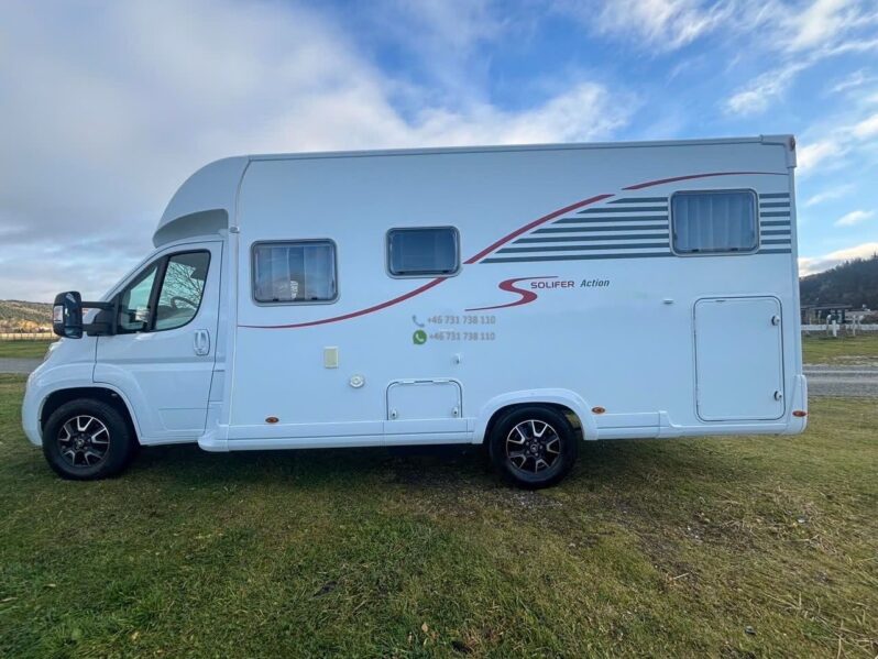Camping-car profilé Solifer T690 E de 2022, modèle récent reconnu pour sa qualité de fabrication nordique, son excellente isolation et son confort de vie. Implantation idéale avec 4 places carte grise / 4 couchages, motorisation 140 Ch en boîte manuelle, équipé panneaux solaires et chauffage Truma pour une autonomie optimale.