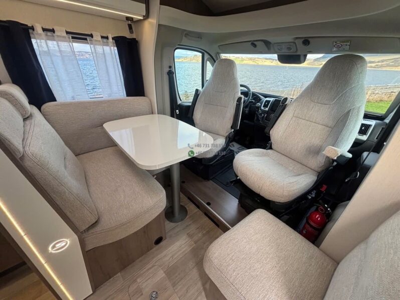 Le Solifer T690 E propose un intérieur moderne, lumineux et parfaitement optimisé. Le salon avant est spacieux et convivial grâce aux sièges cabine pivotants et à la grande table centrale.