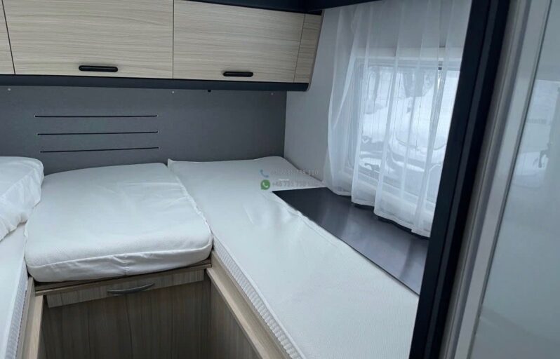 La zone nuit arrière propose généralement des lits jumeaux longitudinaux ou un couchage principal confortable selon implantation. Un couchage double complémentaire est disponible via la transformation de la dinette ou lit pavillon selon version, permettant d’accueillir jusqu’à 4 couchages.