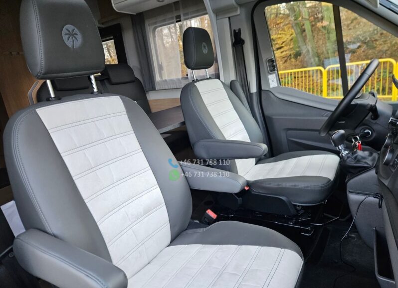 Quant au véhicule lui-même, il est équipé d’un grand écran avec ordinateur de bord, d’un système multimédia complet avec Android Auto/CarPlay/caméra de recul, de l’ABS/ESP/assistance au démarrage en douceur, de rétroviseurs chauffants et à réglage électrique, de superbes jantes en alliage noir, d’un système FordPass avec géolocalisation et verrouillage/déverrouillage à distance du camping-car depuis votre smartphone ! Et quelques autres options intéressantes. Le camping-car est exceptionnellement économe en carburant : à une vitesse de 95 à 100 km/h, il consomme 8,5 L/100 km
